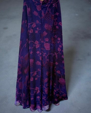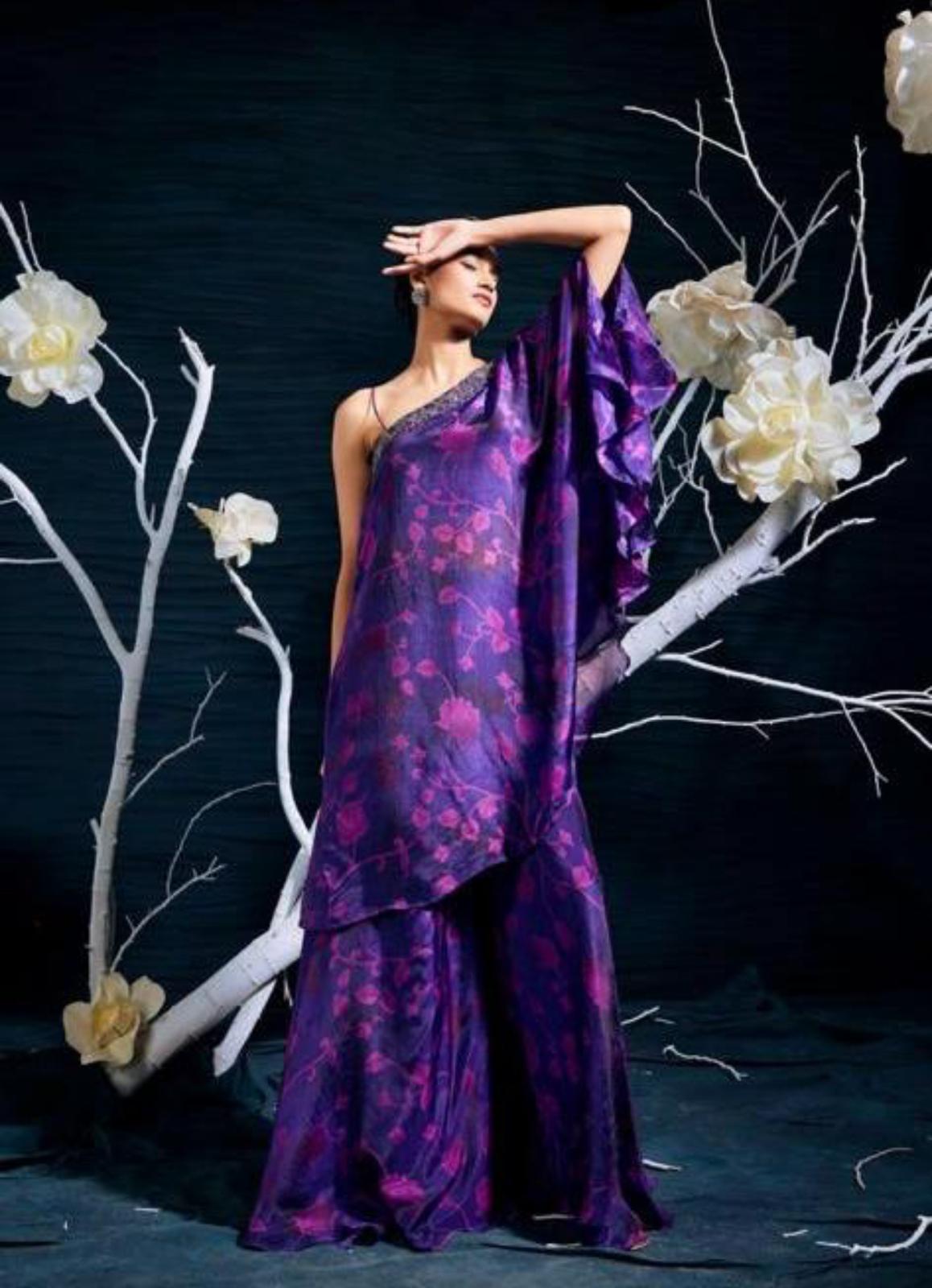 Light Purple Floral designs stand out on this amazing silk deep purple - 3 piece palazzo outfit.